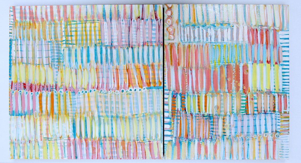 Semi-abstract images where stripes reference words and lines of text. Hopes and fears on the passage of time, memories of happy times, the fabric of the past and thoughts on losing words after a lifetime of eloquence.